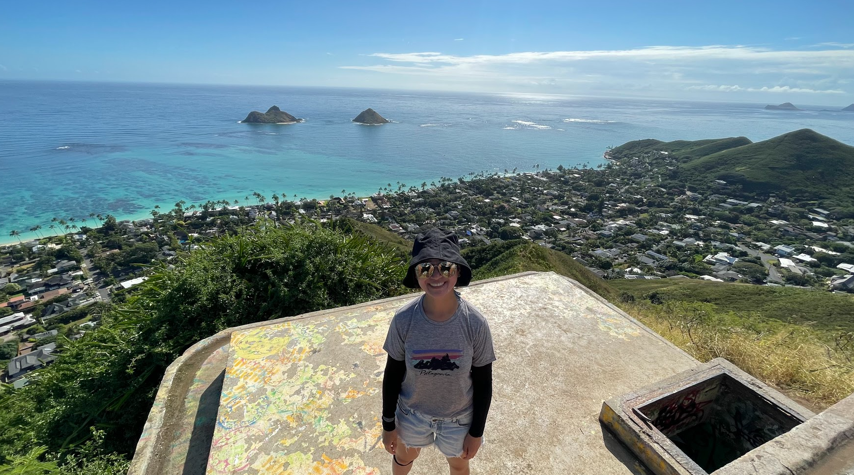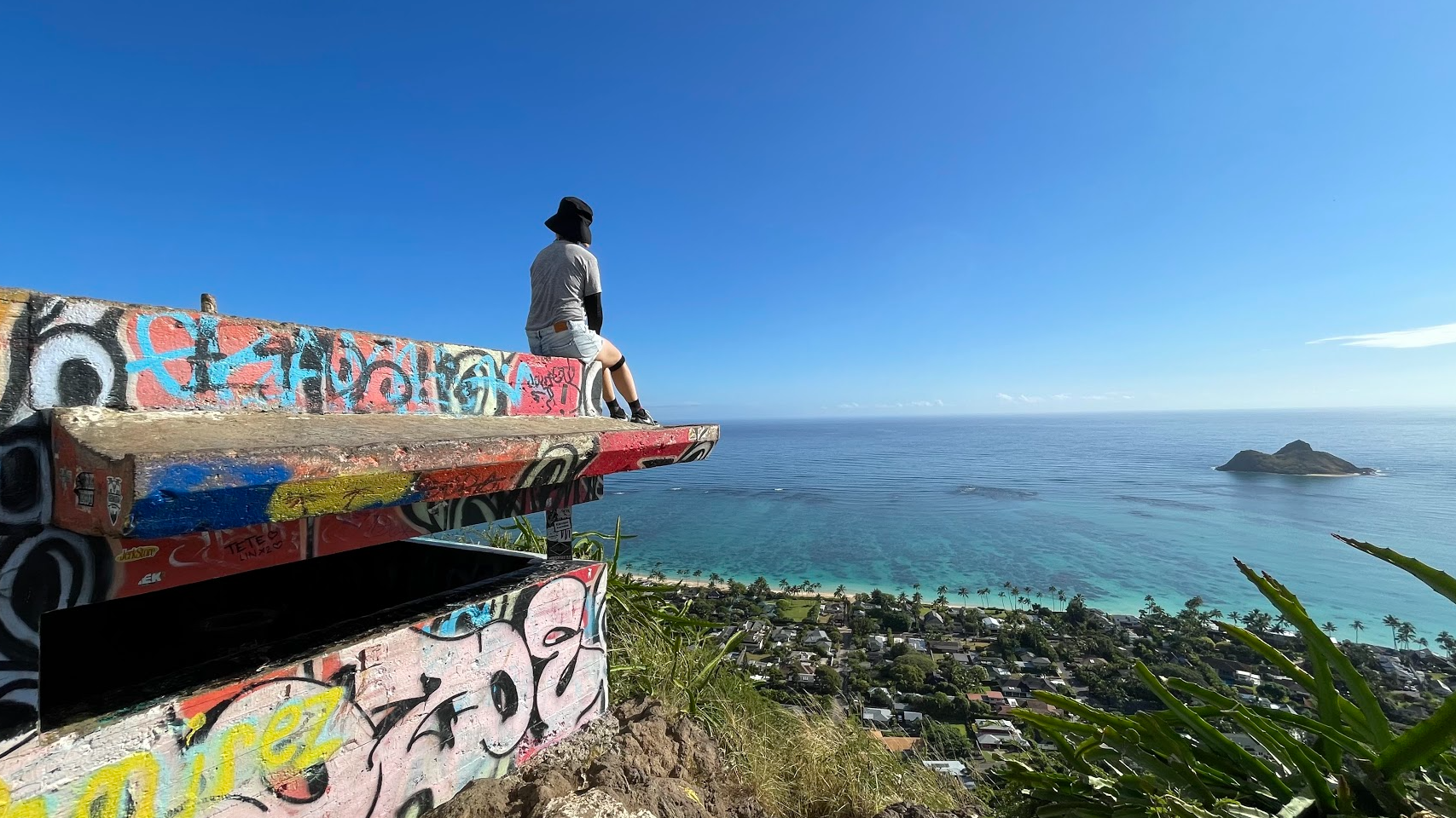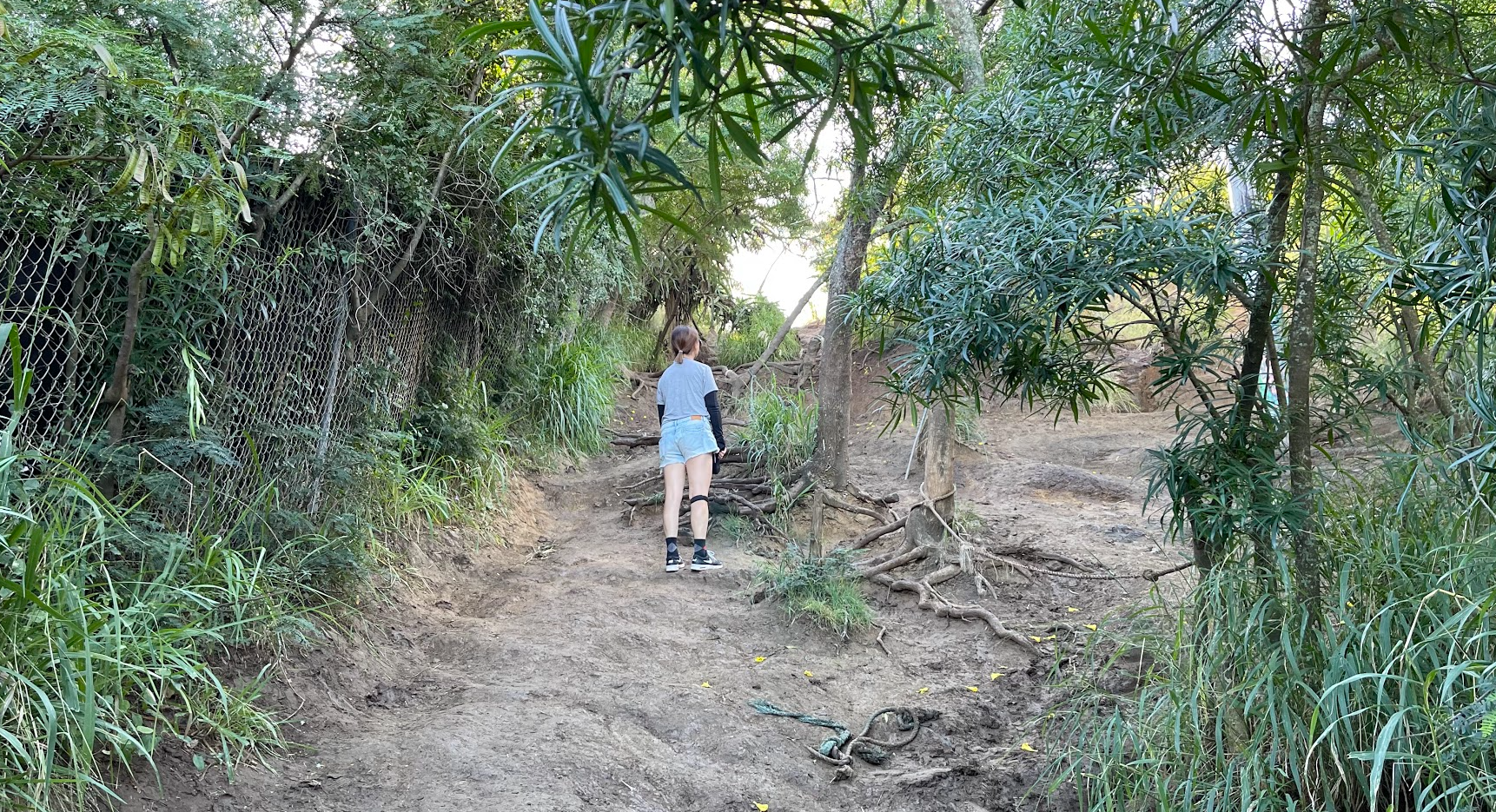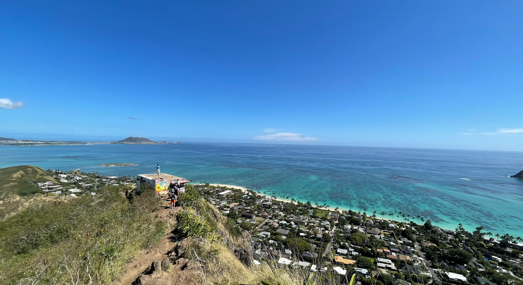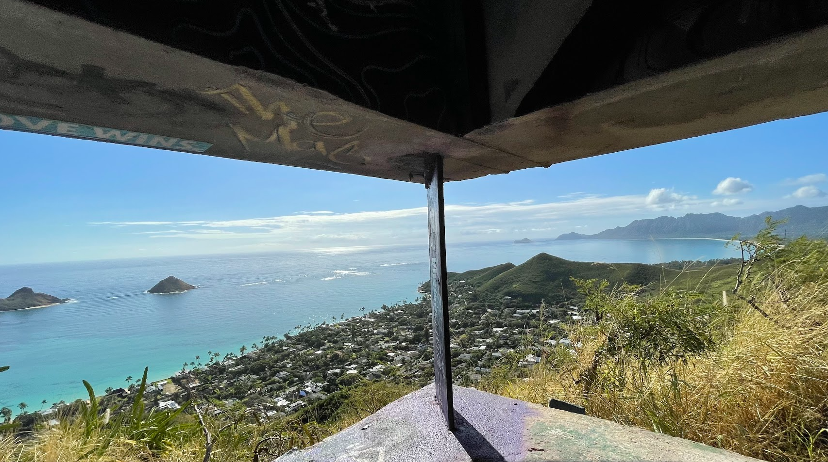 좁고 약간 급한 등산로로 군용 벙커 2개가 있으며 래니카이 비치가 보인다.